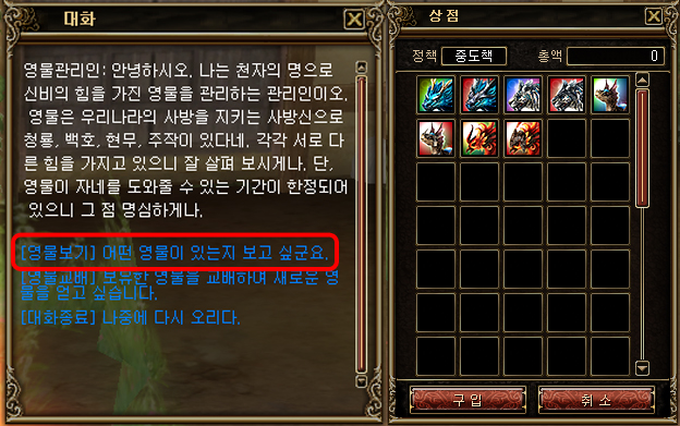 2) 영물관리인과 대화를 하면 자모전으로 살 수 있는 펫 목록을 보여줍니다.